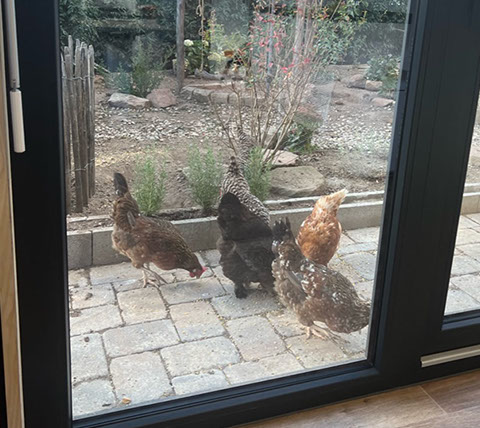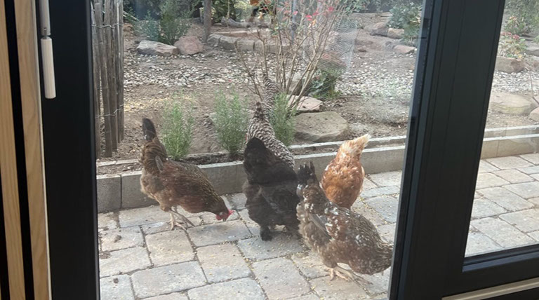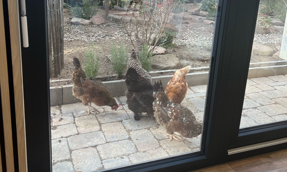 Der Blick von unseren Behandlungsräumen in den Hühnergarten lenkt so manchen Vierbeiner von der Behandlung ab und wirkt auch entspannend auf besorgte Frauchen und Herrchen.